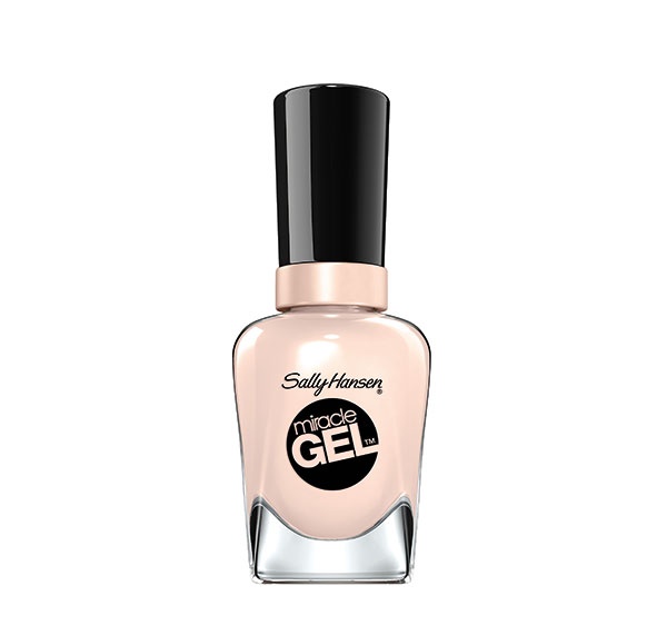 اطلي أظافرك بلون صدفي شفاف Sally Hansen Miracle Gel Refreshment in Birthday Suit no.110، وغلّفي اللون بطلاء واقٍ ولمّاع Bourjois La Laque Gel Top Coat.