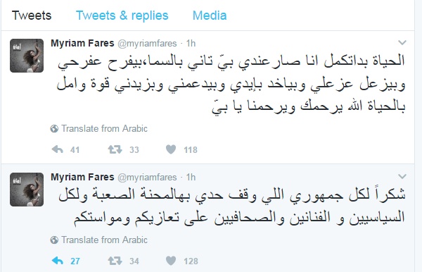 وقالت "ملكة المسرح" عبر حسابها الرسمي على موقع "تويتر": "شكراً لكل جمهوري اللي وقف حدي بهالمحنة الصعبة ولكل السياسيين و الفنانين والصحافيين على تعازيكم ومواستكم..".