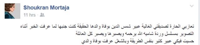 وكتبت مرتجى معزية زميلتها عبر حسابها على موقع "فيسبوك": "تعازيي الحارة لصديقتي الغالية عبير شمس الدين بوفاة والدها الحقيقة كنت جنبها لما عرفت الخبر أثناء التصوير بمسلسل وردة شاميه الله يرحمه ويصبرها ويصبر كل العائلة".