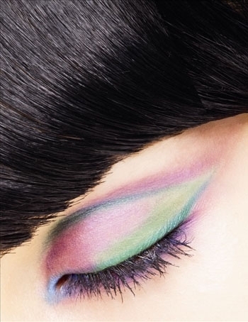 الظلال OMBRE ECLAT 4 SHADES IN PARADIS EXOTIQUE 404 من غيرلان GUERLAIN (للونين الأخضر والوردي)، قلم الكحل CRAYON EYELINER PENCIL WITH BLENDING TIP IN PRECIOUS GREEN NO. 483 من ديور DIOR (تم استعماله في محجر العين).