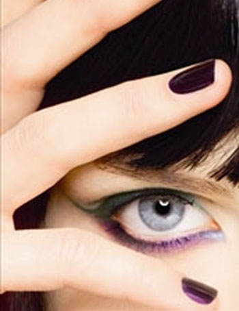 الظلال PINK PUNK AND BLACK EXCEPTIONAL WEAR SMOOTH EYE COLOUR QUAD IN 01 IRREVERENT MADAME (للون الوردي تحت الأهداب السفلية)، والظلال DIOR BACKSTAGE ULTRA SHIMMERING EYESHADOW WATERPROOF IN POP AQUADELIC 342 من ديور DIOR (للون الأخضر). للأظافر، الطلاء LE VERNIS IN NO.483VANDETTA من شانيل CHANEL.