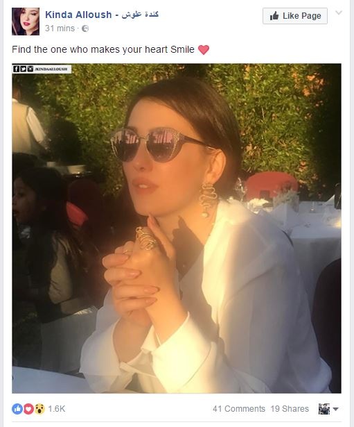 ونشرت بمناسبة يوم الحب صورتها على "فايسبوك" وعلقت عليهاFind the one who makes your heart Smile"، أي "جِد شخصا يجعل قلبك يضحك".