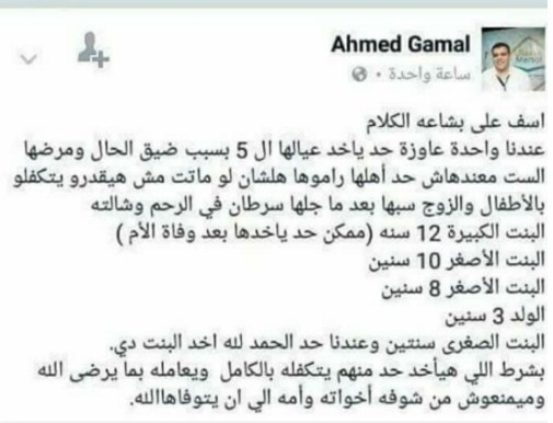 في قصة غريبة، إنتشر على موقع "فايسبوك" رسالة من حساب باسم أحمد جمال، يروى فيه قصة سيدة هزمها المرض وتركها زوجها وأهلها، وتعرض أولادها الخمسة للتبني.