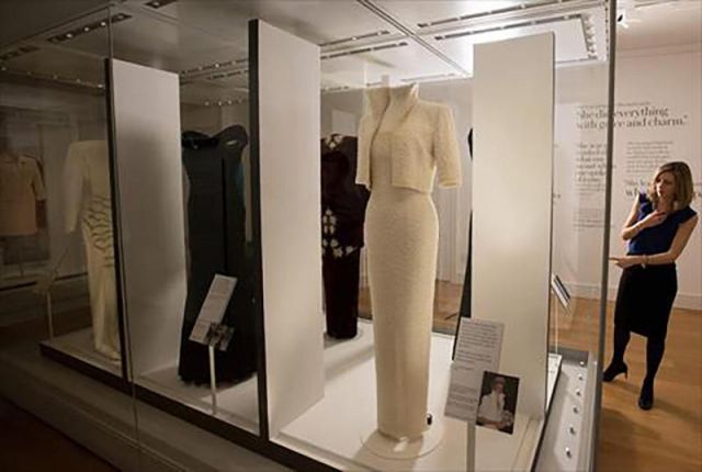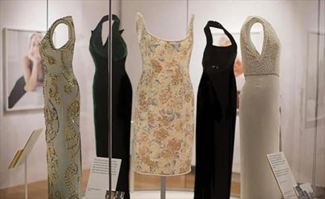 ومن بين المعروضات فستان مخملي أزرق، ارتدته الاميرة الراحلة عندما رقصت مع الممثل جون ترافولتا في البيت الأبيض عام 1985، وفستان "إلفيس" ذي الرقبة الطويلة المرصعة باللؤلؤ.