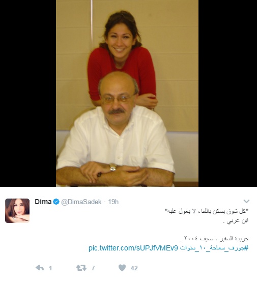 نشرت الإعلامية اللبنانية ديما صادق، عبر حسابها الرسمي على "تويتر" صورة قديمة لها، من العام 2004، حيث ظهرت برفقة مؤسّس جريدة "الأخبار" اللبنانية الصحافي الراحل جوزف سماحة.
