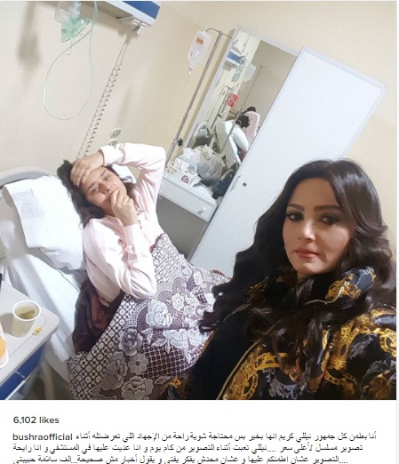 وعلقت بشرى على الصورة التي تظهر من خلالها نيللي على سرير المرض، قائلة: "أنا بطمن كل جمهور نيللي كريم إنها بخير بس محتاجة شوية راحة من الإجهاد اللي تعرضت له أثناء تصوير مسلسل لأعلى سعر... نيللي تعبت أثناء التصوير من كام يوم وأنا عديت عليها في المستشفى و أنا رايحة التصوير عشان أطمنكم عليها وعشان محدش يفكر يفتي و يقول أخبار مش صحيحة...الف سلامة حبيبتي".