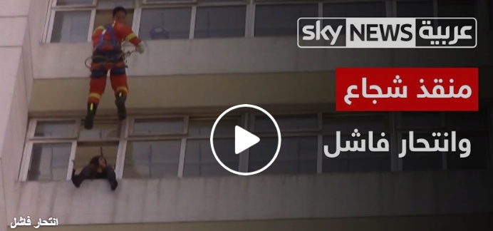 وأظهر الفيديو تدلي رجل الاطفاء بالحبل من الطابق الأعلى للمكان الذي كانت الفتاة تحاول الانتحار منه، قبل ان يقفز ويركلها الى الداخل.