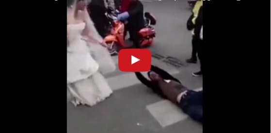 ويظهرالفيديو العروس خلال تكبيلها العريس بالسلاسل وجرّه على الطريق.