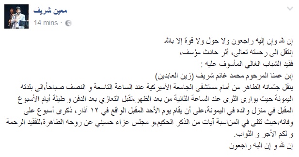 ونعى شريف قريبه عبر حساباته على شبكات التواصل الاجتماعي كاتباً: "إنا لله وإنا إليه راجعون ولا حول ولا قوة إلا بالله، إنتقل الى رحمته تعالى، اثر حادث مؤسف، فقيد الشباب الغالي المأسوف عليه إبن عمنا المرحوم محمد غانم شريف (زين العابدين).