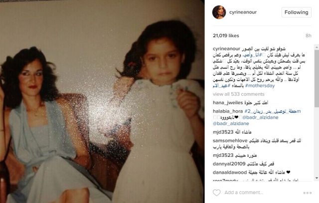 ومن أبرز هذه الفنانات، النجمة اللبنانية سيرين عبد النور، التي نشرت صورة من طفولتها الى جانب والدتها، وكتبت: "شوفو شو لقيت بين الصور انا وأمي، وعم برقص كمان. ما بعرف ليش هيك كان شكلي، بس قلت بضحكن وبعيدكن بنفس الوقت، بعيّد كل ام... وامي حبيبتي الله يخليلي ياها، وما رح انسى مثل كل سنة اتمنى الشفاء لكل أم... ويصبرها على فقدان اولادها.. والله يرحم روح كل الامهات وتكون نفسهن بالسماء عيد الام".