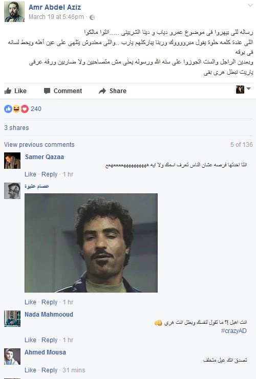 وكتب على "فايسبوك": رساله للي بيهروا في موضوع عمرو دياب ودينا الشربيني... انتوا مالكوا اللي عندة كلمه حلوة يقول مبروك وربنا يباركلهم يارب.. واللي معندوش يتلهى على عين أهله ويحط لسانه في بوقه.