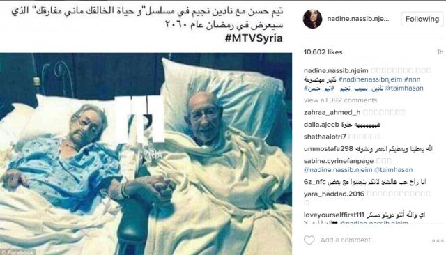 وكُتب على الصورة ما يلي: "تيم حسن مع نادين نجيم في مسلسل "وحياة الخالقك ماني مفارقك" الذي سيعرض في رمضان عام 2060".