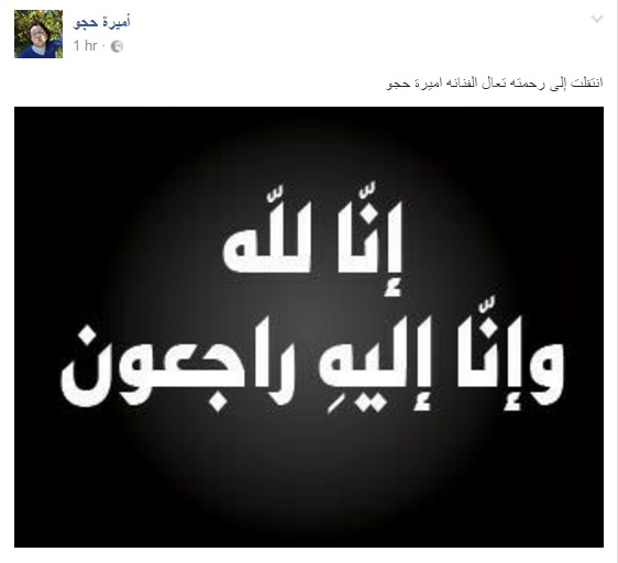 ونعت صفحة الممثلة على موقع "فيسبوك" وعدد من الفنّانين السوريين كشكران مرتجى ومحمد خير الجرّاح، الراحلة منذ قليل.