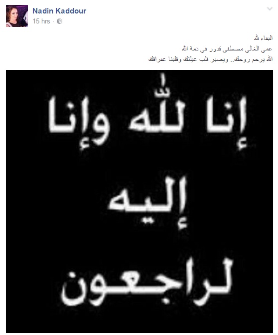 فجعت الممثلة السورية ندين قدور بوفاة عمها نعياً اياه عبر حساباتها على شبكات التواصل الاجتماعي بقولها: "البقاء لله، عمي الغالي مصطفى قدور في ذمة الله، الله يرحم روحك.. ويصبر قلب عيلتك وقلبنا عفراقك".