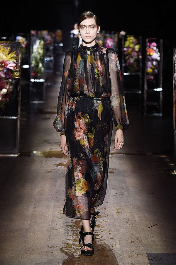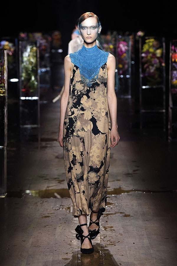 على أنغام أغنية Frozen للفنانة مادونا من ألبوم Ray of Light، اختالت العارضات على المنصة المزينة بباقات أزهار موضوعة ضمن كتل كبيرة من الجليد. واللافت أن هذه المنحوتات الجليدية، التي صنعها الفنان الياباني أزوما ماكوتو، بدأت تذوب خلال العرض، مما أفضى إلى تناثر قطرات الماء على منصة العرض. وظهرت الأزهار أيضاً في فساتين الحرير وبذلة سروال بسيطة بألوان خريفية.