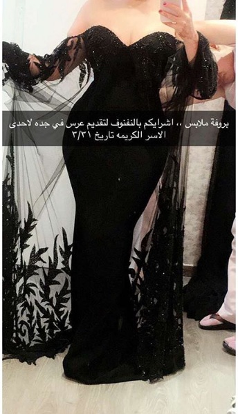 وكشفت عن الفستان الأسود الطويل والضيق، الذي سترتديه في أحد الأفراح في جدّة اليوم.