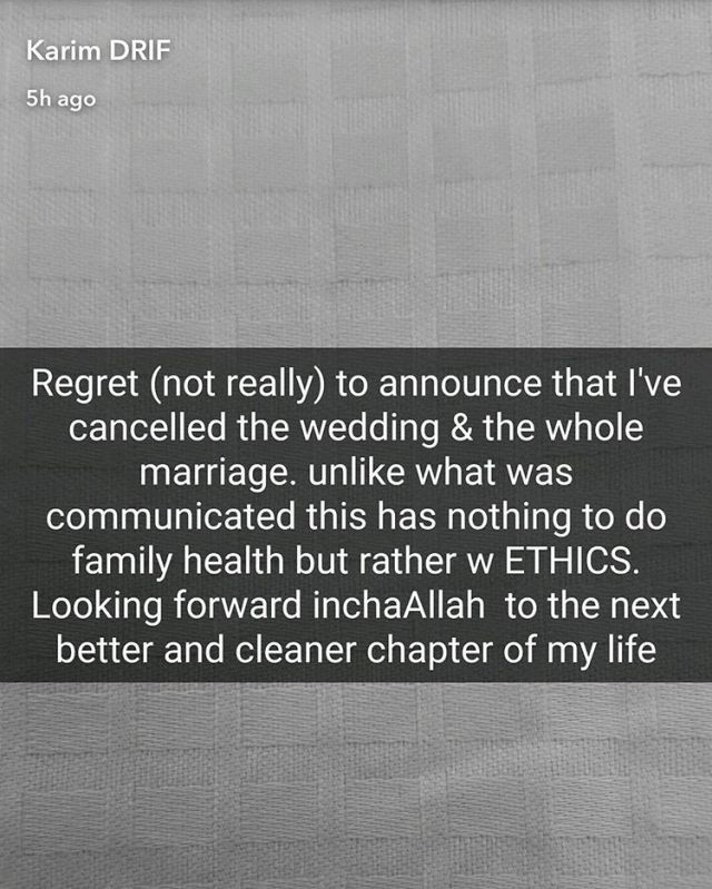 نشر ظريف على تطبيق "سناب شات" صورة أعلن فيها إلغاء الزفاف نهائياً، وذلك رداً على رسالة أرسلتها سعيد للمدعويين قالت فيها أنها أجلت زفافها بسبب وعكة صحية مفاجئة ألمت بوالدها.