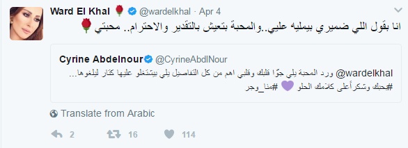 من جهتها، غرّدت عبد النور وشكرت زميلتها، وكتبت: "ورد المحبة يلي جوّا قلبك وقلبي اهم من كل التفاصيل يلي بيشتغلو عليها كتار ليلغوها... بحبك وشكراً على كلامك الحلو".