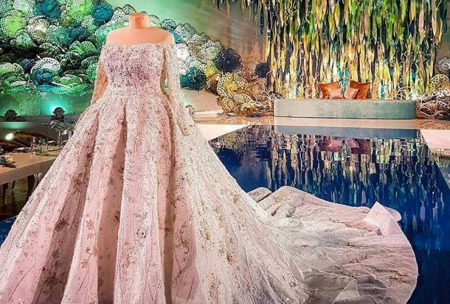 كما ظهرت فيه تفاصيل على درجة كبيرة من الفخامة. وشملت صالة الحفل وملابس المنظّمين والمساعدين والورود وبطاقات الدعوة المرصّعة وهدايا الضيوف الثمينة.