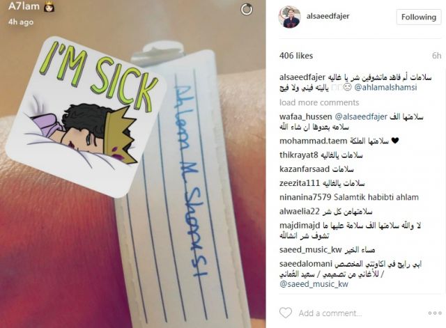 نشرت الكاتبة الكويتية فجر السعيد، صديقة النجمة الإماراتية أحلام المقربة، عبر حسابها على تطبيق "انستغرام" صورة من حساب الفنانة الخليجية على تطبيق "سناب شات" أظهر دخولها المستشفى.