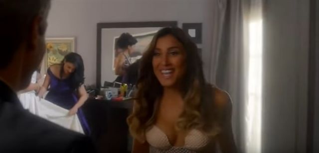 وظهرت الشربيني بفستان أبيض مكشوف الصدر الى حد كبير، خلال مشهد حفلة صديقتها في العمل.