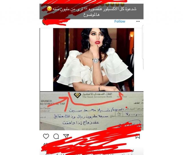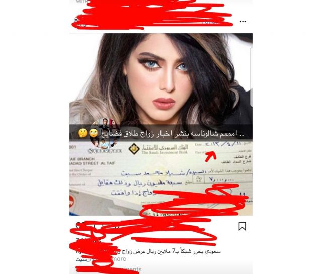 انتشرت مؤخراً صورٌ، عبر مواقع التواصل الاجتماعي، لشيك مالي بقيمة 7 مليون ريال، موجّه للممثلة البحرينية شيلاء سبت مقابل عقد للزواج من رجل أعمال سعودي.