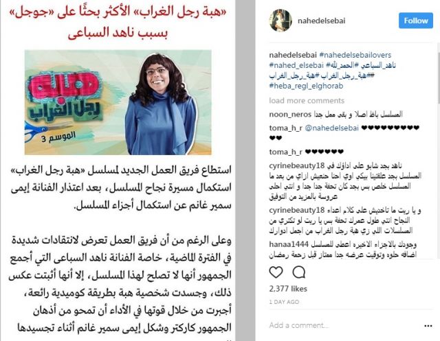 أمّا السباعي فأبت السكوت عن كلام ايمي، وردّت بطريقة أقوى، ونشرت مقالاً، مفاده أنّ "الفنانة ناهد السباعي التي أجمع الجمهور أنها لا تصلح لهذا المسلسل، أثبتت العكس، وجسدت شخصية هبة بطريقة كوميدية رائعة، أجبرت من خلال قوتها في الأداء أن تمحو من أذهان الجمهور كاركتر وشكل ايمي سمير غانم، أثناء تجسيدها".