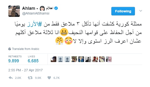 وغردت أحلام قائلةً: "ممثلة كورية كشفت أنها تأكل ٣ ملاعق فقط من الأرز يوميًا من أجل الحفاظ على قوامها النحيف".