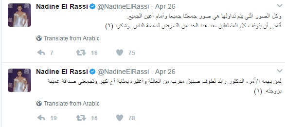 وكانت غردت نادين، وكتبت: "لمن يهمه الأمر، الدكتور رائد لطوف صديق مقرب من العائلة وأعتبره بمثابة أخ كبير وتجمعني صداقة عميقة بزوجته".