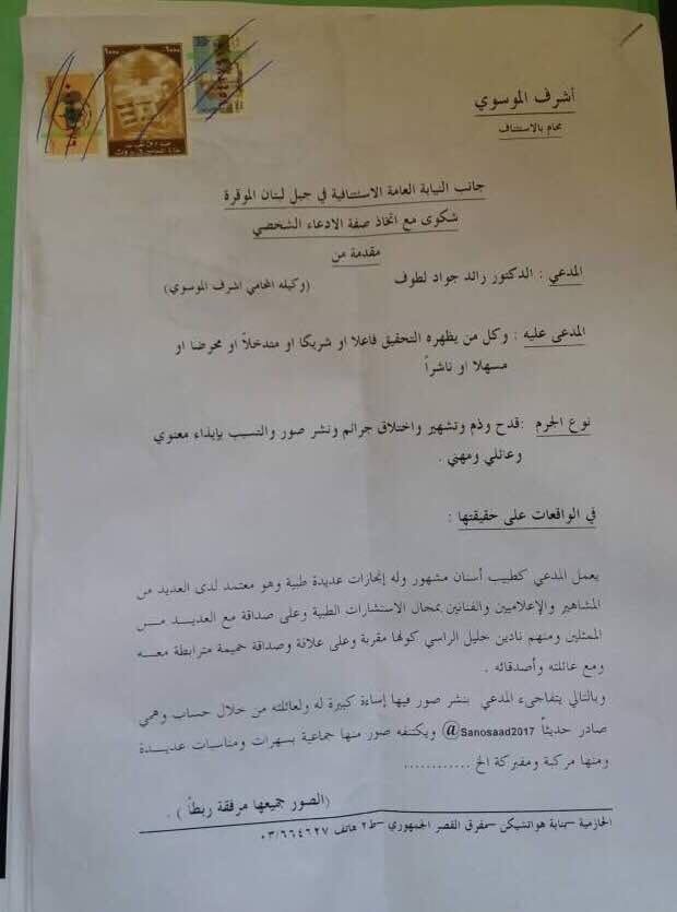 تقدم الطبيب رائد لطوف وزوجته بشكوى قضائية ضد كل من يظهره التحقيق متورطاً بجرم التشهير واختلاق جرائم عبر نشر صور مع الممثلة نادين الراسي، وأحيلت الشكوى إلى المباحث الجنائية والمعلوماتية للتحقيق ومعرفة هوية الفاعل وتوقيفه. كما تقدم د. لطوف بطلب استدعاء أمام قاضي الامور المستعجلة في جبل لبنان، يمنع بموجبه نشر أي صور أو تداول أي خبر تحت طائلة غرامة إكراهية بقيمة ٥٠ مليون ل.ل لكل مخالفة على أي موقع أو وسيلة إعلامية مرئية أو مكتوبة أو مسموعة.