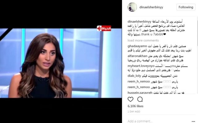 ونشرت الشربيني، عبر حسابها الرسمي على تطبيق "انستغرام" صورة لها من الحلقة، المقرّر إذاعتها اليوم، وكتبت: "استنوني يوم الأربعاء الساعة 10 مساءً في برنامج فحص شامل".