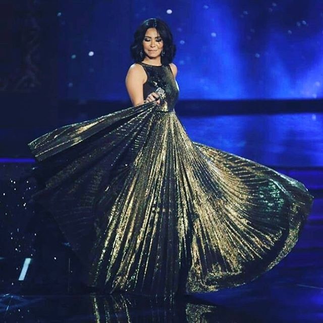 كما رصدت إليسا باللون الذهبي على شكال الرداء السروالي، وتميزت ببريق الألوان المعدنية شيرين عبد الوهاب بفستان بقصة البليسيه الملفتة.