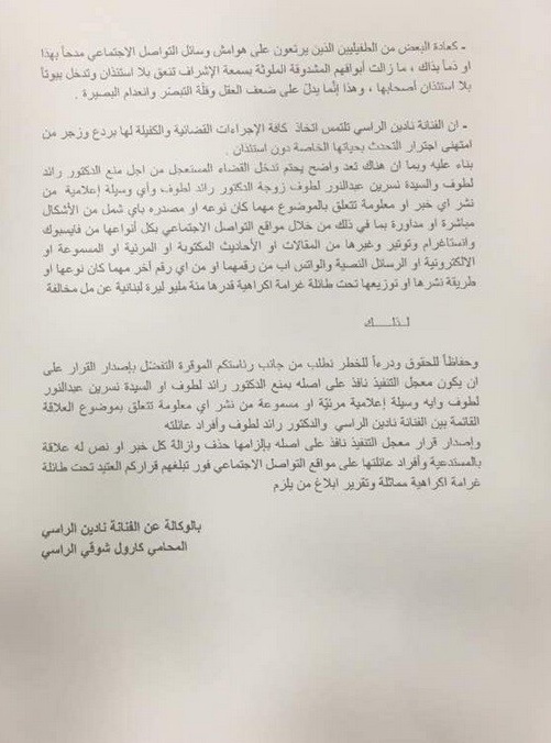 وفي خطوة لافتة، خصّت الراسي عبر محاميتها كارول شوقي الراسي الدكتور لطّوف وزوجته بالقول: "هناك تعد واضح يحتم تدخل القضاء المستعجل من اجل منع الدكتور رلائد لطوف والسيدة نسرين عبد النور واي وسيلة اعلامية من نشر اي خبر او معلومة تتعلق بالموضوع...".