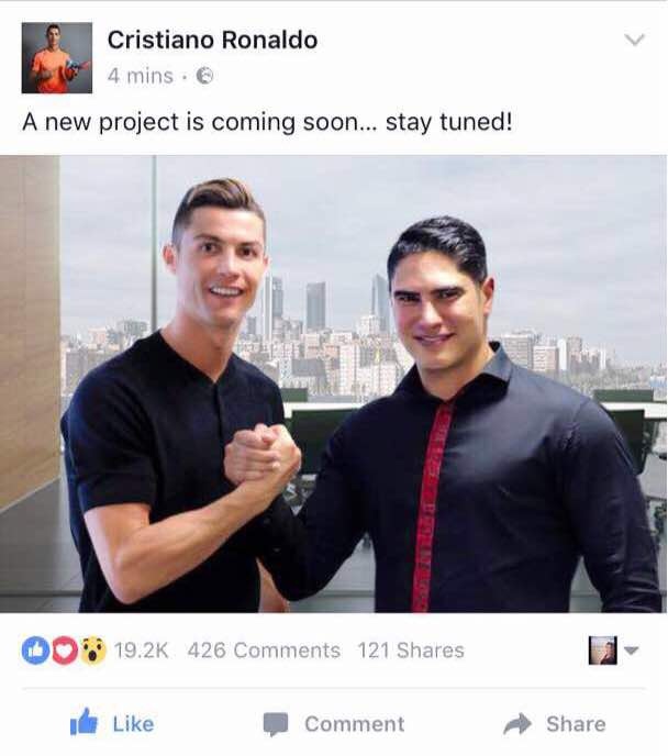 وعلّق رونالدو، على الصورة التي يصافح فيها أبو هشيمة قائلاً: "مشروع جديد قريباً.. ترقبوا".
