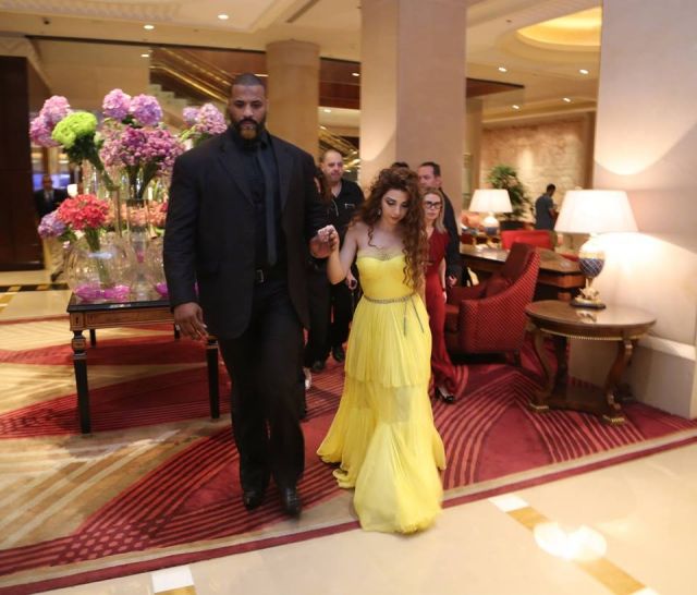كما ظهرت النجمة والحارس في صورة أخرى بدا فيها الأخير يقف إلى جانبها فيما تدخل هي إلى قاعة الحفل.
