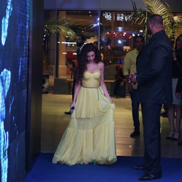 وظهرت فيها وهي تسير إلى جانبه قبل حلول موعد حفل أقامته أخيراً في أحد الفنادق الكبرى في مصر. واللافت أنها كانت تتكئ على يده أثناء سيرها.