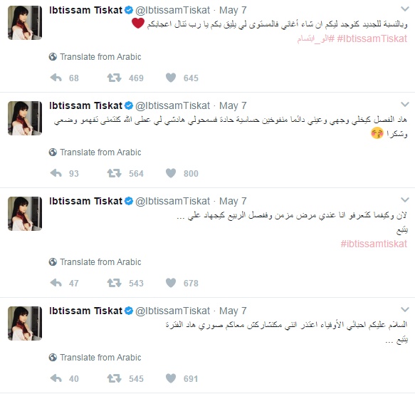 وغرّدت تسكت عبر حسابها الرسمي على "تويتر": "السلام عليكم احبائي الأوفياء اعتذر انني لم أشارككم بصوري هذه الفترة لأنني، كما تعرفون، عندي مرض مزمن وففصل الربيع كيجهاد علي..."