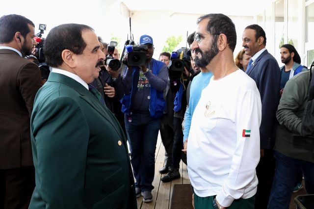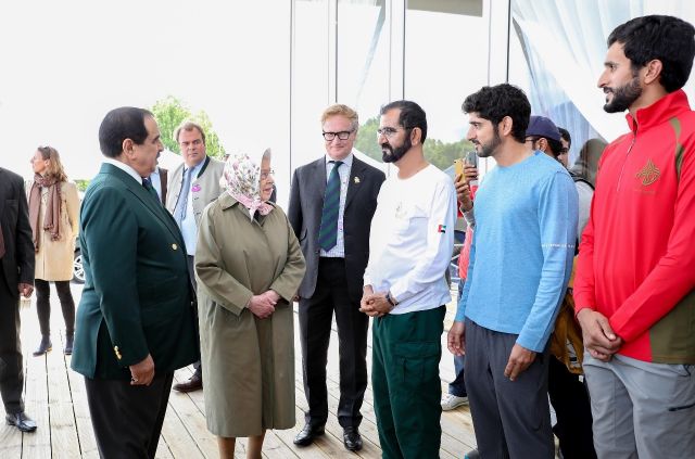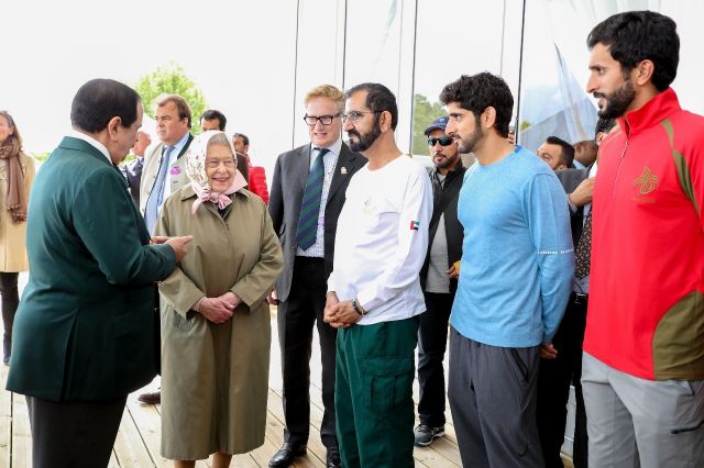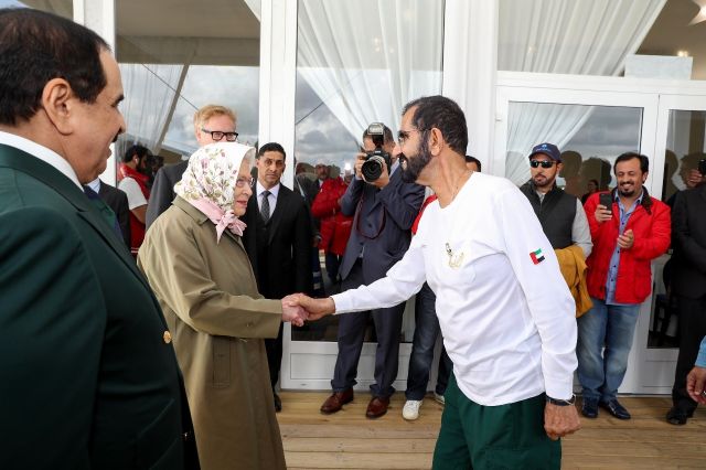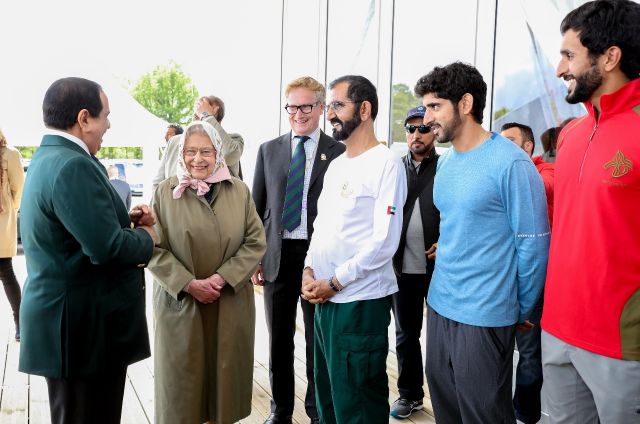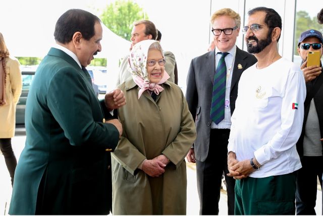والتقي الشيخ محمد بن راشد آل مكتوم الملكة إليزابيث الثانية ملكة بريطانيا ودول الكومنولث بحضور ملك مملكة البحرين وولي عهد دبي وذلك على هامش فعاليات مهرجان رويال ويندسور للقدرة.