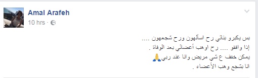 وجاء في منشور لعرفة في حسابها الشخصي على موقع "فيسبوك": "بس يكبرو بناتي رح اسألهون ورح شجعهون ....إذا وافقوا .... رح اوهب أعضائي بعد الوفاة" .