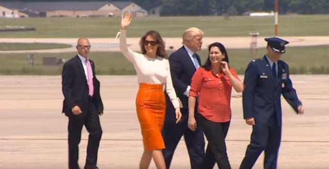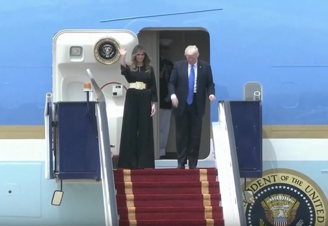 وكانت ميلانيا قبل صعودها الطائرة وهي في أميركا، ترتدي "بلوزة بيضاء" وتنورة برتقالية قصيرة، لكنها غيّرت زيها في الطائرة وارتدت العباءة السوداء قبل وصولها إلى الرياض.