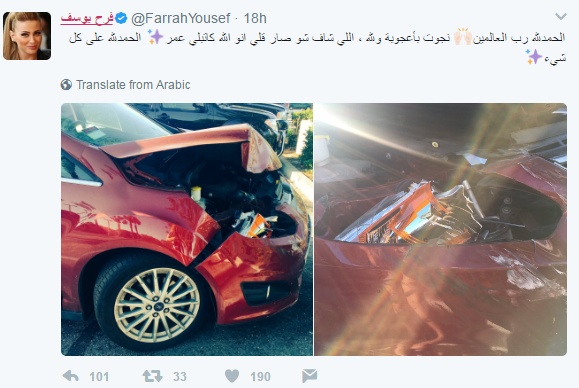 ونشرت فرح، عبر حسابها الرسمي على "تويتر"، صورة للسيارة المحطّمة، وكتبت: "الحمدلله رب العالمين. نجوت بأعجوبة ولله، اللي شاف شو صار قلي انو الله كاتبلي عمر. الحمدلله على كل شيء"، ما يؤكّد أنّها بخير.