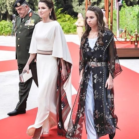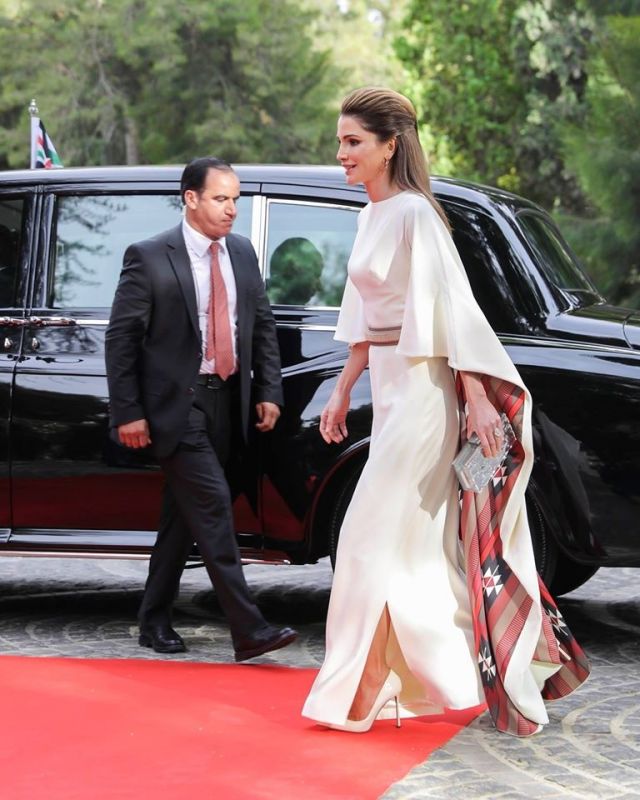 وظهرت الملكة خلال الاحتفال بعيد استقلال الأردن بفستان باللون الأبيض العاجي بقصة الكاب الملفت بطبعاته التقليدية وزينته بحزام عريض من الجلد البنيّ اللون والمعدن الذهبي.