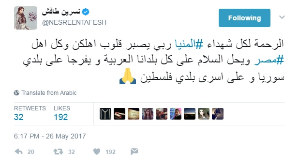 نعت النجمة العربية نسرين طافش ضحايا المجزرة الإرهابية في مدينة المنيا متقدمة بواجب التعازي للمصريين، كما وجّهت كلمات مؤثرة مليئة بالسلام للعالم العربي وسورية والأسرى الفلسطينيين.