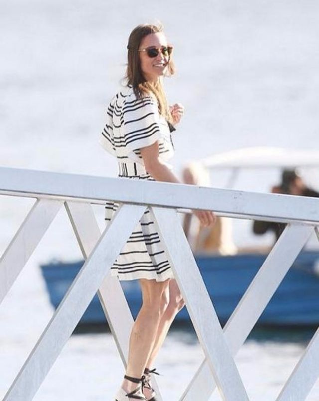 وقد اختارت بيبا، 33 عاماً، لوك أنيقاً وغير متكلّف. وارتدت سترة سوداء قصيرة وفستاناً باللون الأبيض المزيّن بخطوط سوداء.