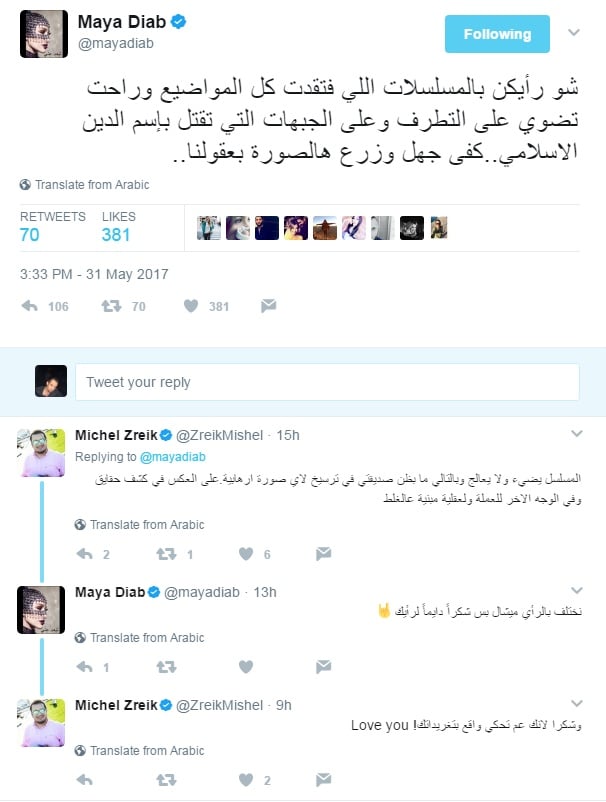 وغرّدت دياب عبر حسابها الرسمي على موقع "تويتر": "شو رأيكن بالمسلسلات اللي فقدت كل المواضيع وراحت تضوي على التطرف وعلى الجبهات التي تقتل بإسم الدين الاسلامي..كفى جهل وزرع هالصورة بعقولنا".