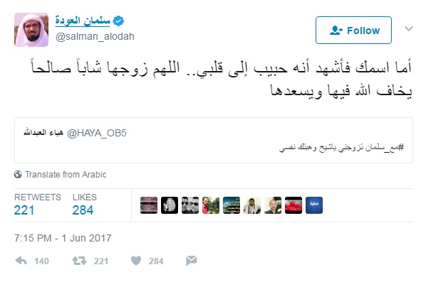 فوجئ الداعية السعودي سلمان العودة بمغردة تطلب منه الزواج عبر موقع التواصل الاجتماعي "تويتر".