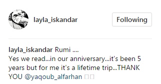 وعلّقت على الصورة، وكتبت: "الرومي... نعم نقرأ.. انه عيد زواجنا. لقد مضت 5 سنوات، لكنها بالنسبة لي أشبه برحلة طويلة الأمد.. شكراً لك يعقوب الفرحان".