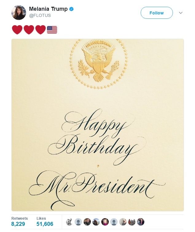 وتوضح الصورة ما كتبته ميلانيا على البطاقة وهو عبارة “عيد ميلاد سعيد يا سيدي الرئيس”، جاءت تحت ختم رئاسي ذهبي.