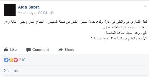 وأشارت الى أنّ "التعازي في والدتي تقبل في منزل ولدها جمال صبرا الكائن في محلة السبينس - الجناح- شارع حتي - بناية زهر - ط.٩ - تجاه سفارة سلطنة عمان. يومي الجمعة والسبت لغاية الساعة الخامسة. والأربعاء القادم من الساعة ٣ لغاية الساعة ٦".