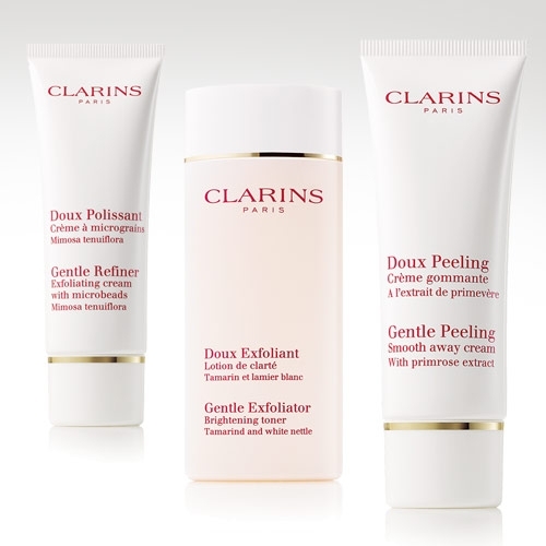 أطلقت دار كلارنس Clarins 3 مستحضرات جديدة لتقشير الوجه، Soins Exfoliants Visage، تعمل كلها على جعل البشرة أكثر شباباً ونقاوة وتألقاً عبر التخلص من طبقة الخلايا الميتة وتجديد الخلايا والحفاظ على شباب البشرة. المستحضر الأول هو Gentle Exfoliator Brightening Toner الذي يوفر إحساساً رائعاً بالنضارة والراحة، فيما المستحضر الثاني هو Gentle Peeling Smooth Away Cream الذي يقضي على المظهر الباهت والشاحب في البشرة، والمستحضر الثالث هو Gentle Refiner Exfoliating Cream المشتمل على كريات مجهرية قادرة على إزالة كل الأوساخ والخلايا الميتة بفاعلية مذهلة.